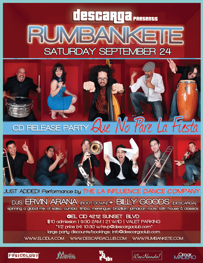 This Saturday September 24th, Descarga presents the CD Release Party for RUMBANKETE 'Que No Pare La Fiesta', the quintessential Timba group, based in Los Angeles. It's going to be high energy from the first note and the perfect night to get familiar with this lively salsa-sub-genre. Guest DJs ERVIN ARANA (Root Down) & BILLY GOODS will be mixing up global flavored rhythms to keep the dance floor movin between sets.