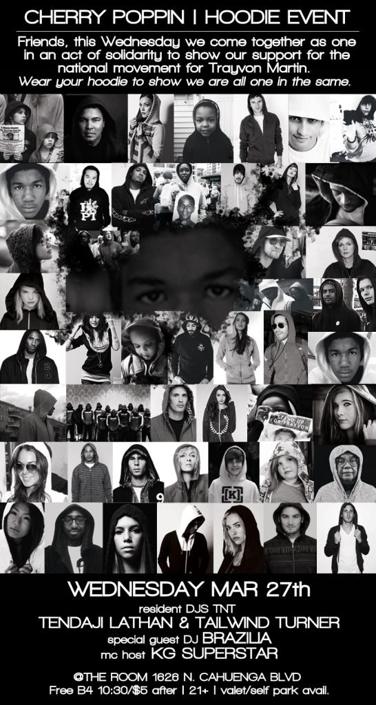 This Wednesday at Cherry Poppin we are cultivating a special "HOODIE" event to use it as message apparel in support of the national movement for Trayvon Martin, to show that beneath the hood we all live and breath, have concerns, have families, have jobs, go to school, go to church, love music & dancing, enjoy good conversation, love to laugh, etc, etc. That what we wear or the area we travel in does not define who we are as individuals. That holding onto and being controlled by fearful thoughts about individuals and making decisions based on our own prejudices without taking the time to know them can eventually lead to dire consequences.