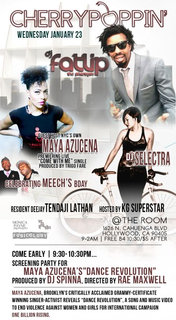 CHERRY POPPIN keeps on and poppin with special guest DJ FATLIP from the one and only, PHARCYDE. Also singer MAYA AZUCENA will be guest host and premiering her video "Dance Revolution produced by DJ SPINNA, directed by RAE MAXWELL. A song and video to end violence against women for the international campaign ONE BILLION RISING
