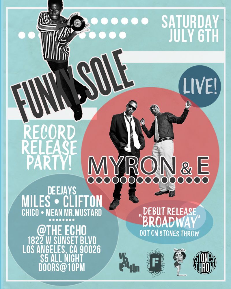 This Saturday, July 6, at the deep funk party in Echo Park, FUNKY SOLE, Myron & E will perform live to celebrate their new release. Perfect compliment to their brand of soul. Deejays Miles of the Breakestra and Root Down roots alongside Clifton will be providing the selections for this funky get down event.