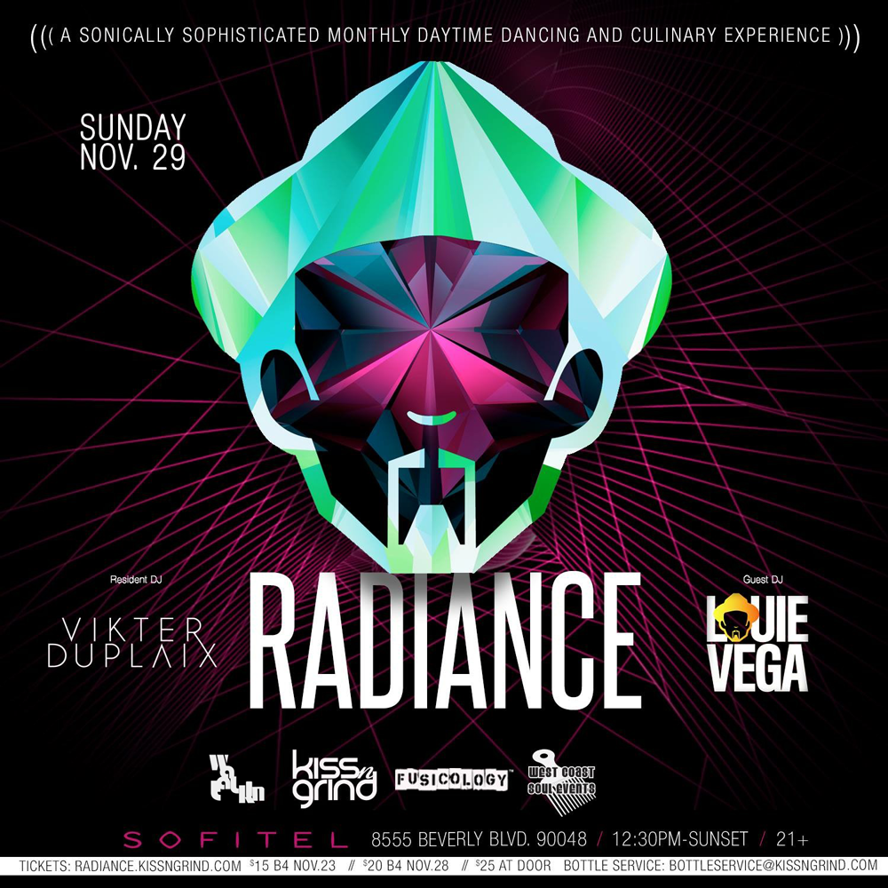 California is still learning that one of the benefits of this state is to be able to do daytime/outdoor events almost year around and even rarer is one of most revered DJs and house music producers of our time spinning at one of them; RADIANCE day party with LOUIE VEGA and VIKTER DUPLAIX will be setting it off at 12:30 til Sunset at the Sofitel on Sun Nov 29. So all the house heads, day-party heads, good-music heads, dope-location heads, dance-til-u-sweat heads, this is def not one to miss.